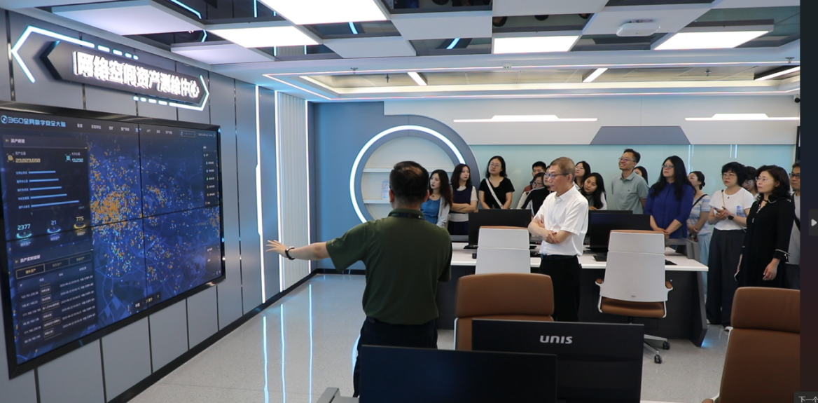 青年教师实地参观了360集团网络空间资产测绘中心、国家大数据安全靶场、大模型应用实验室、产业培训中心,了解360公司在网络安全、大数据、人工智能等前沿科技领域取得的最新成果,并就网络信息安全、校企数字化转型、数字安全培训等内容与园区工作人员进行交流。